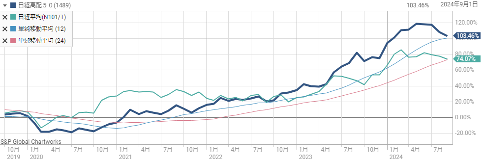 日経平均株価が74%上昇しているのに比べ、【1489】日経高配当50ETFは103%上昇と大幅に上回っています。