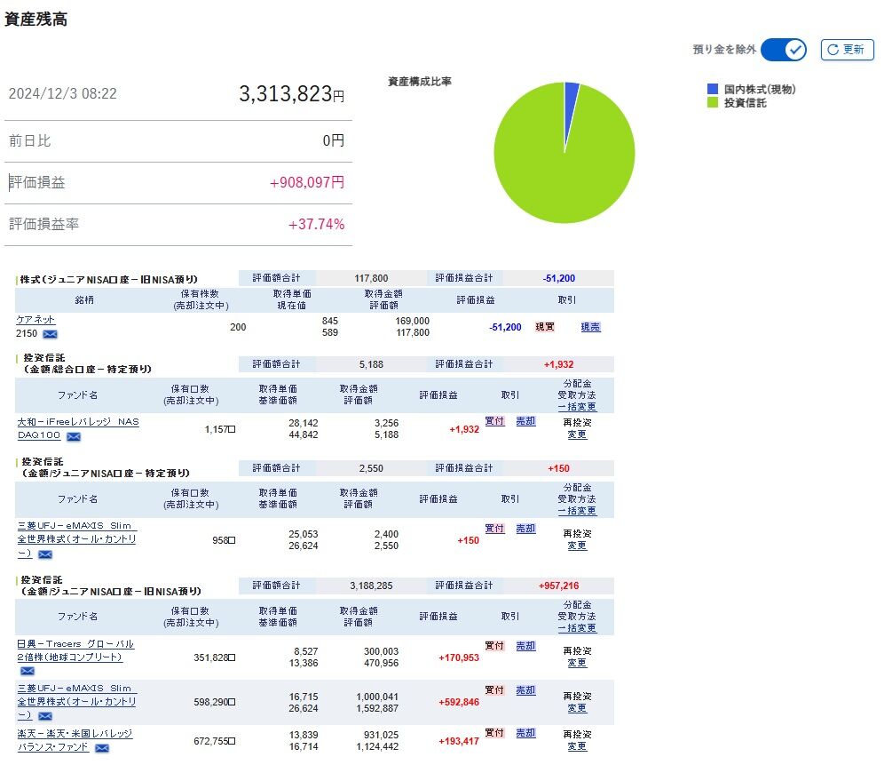 投資元本240万円に対して、資産額は3,313,823円となりました。