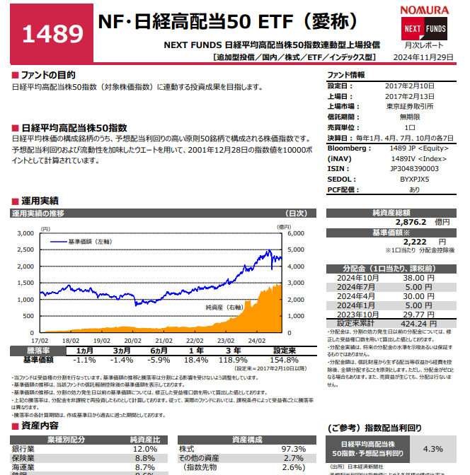 【1489】日経高配当50ETFの11月末予想配当利回りは4.3%となりました。