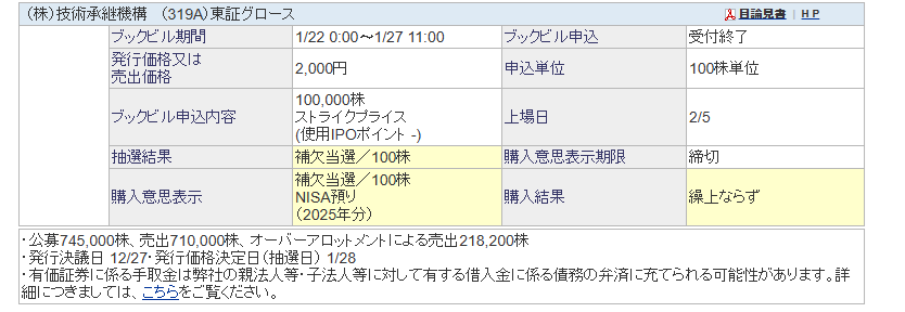 IPOに補欠当選していた技術承継機構ですが、繰り上げ当選とはなりませんでした。