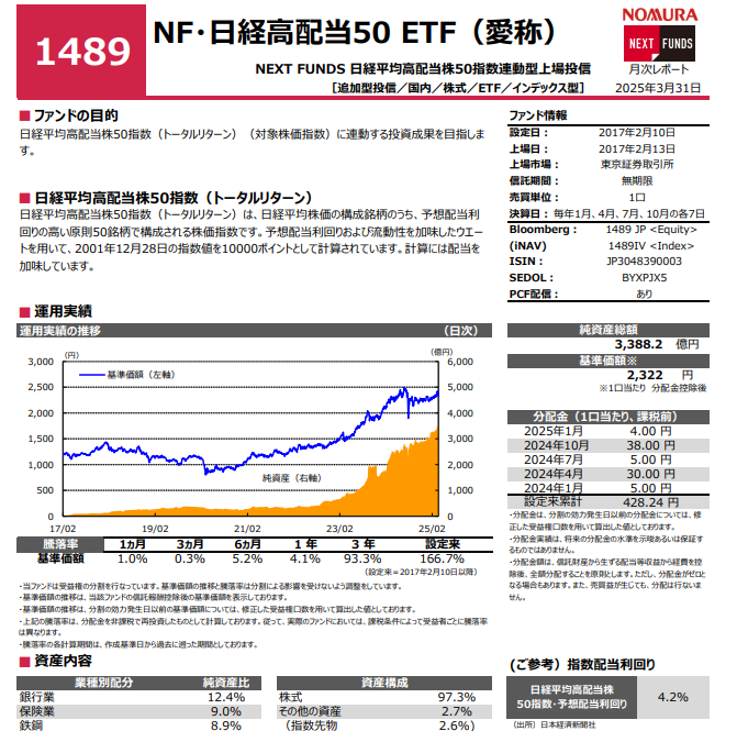【1489】日経高配当50ETFの3月末時点の指数予想配当利回りは4.2%となりました。