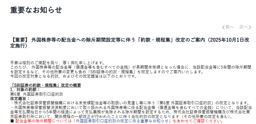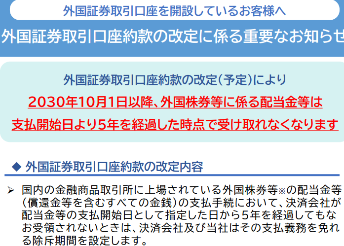 証券会社より「外国株券等の配当金への除斥期間設定等に伴う「約款・規程集」改定」というお知らせが届きました。