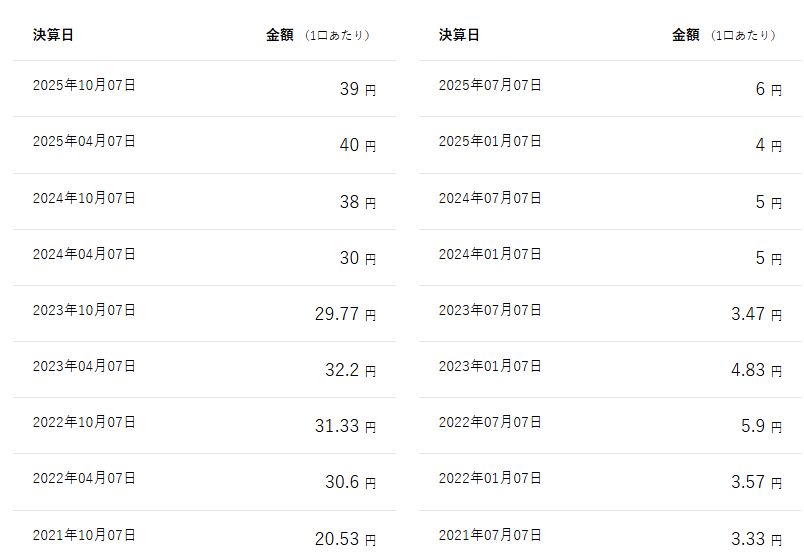 2024年が78円の分配金、2025年が89円ですので、前年比14%の増配となりました。年間で見ると、しっかり増えてますね。